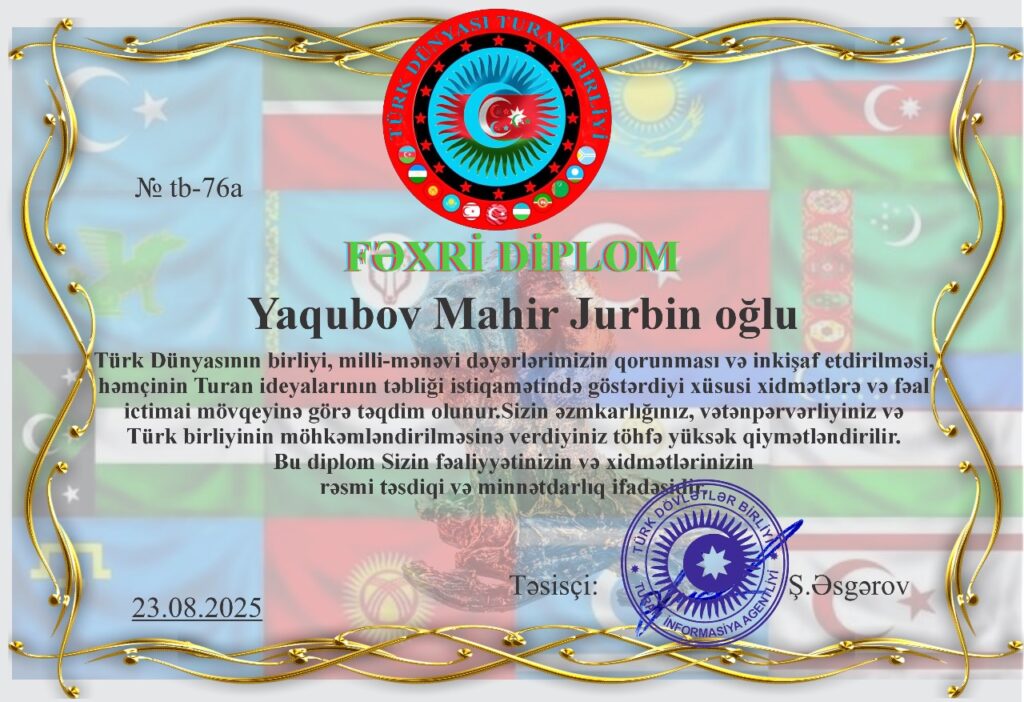 Türk dünyasının birliyi və həmrəyliyi yolunda mühüm fəaliyyət göstərən şəxslər daim diqqət mərkəzində saxlanılır. Bu istiqamətdə əlamətdar hadisələrdən biri də Türk Dünyası Turan Birliyinin fəal üzvlərindən olan Yaqubov Mahir Jurbin oğlunun birlik tərəfindən “Fəxri Diplom”la təltif edilməsi olmuşdur.